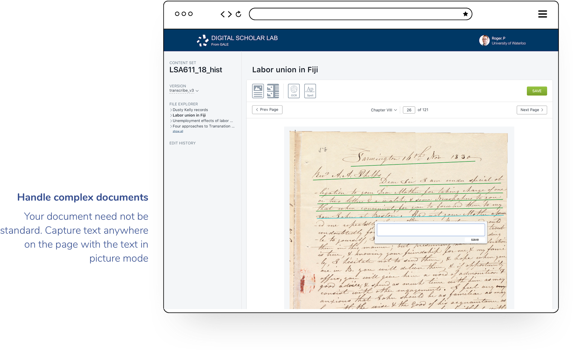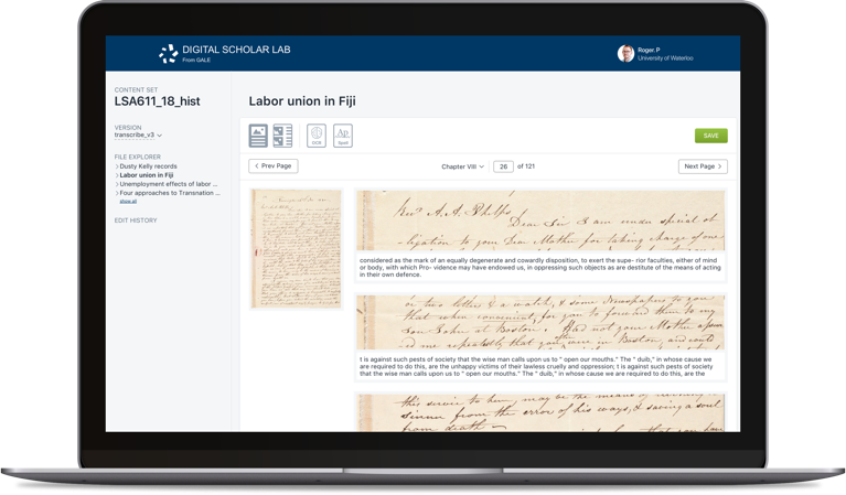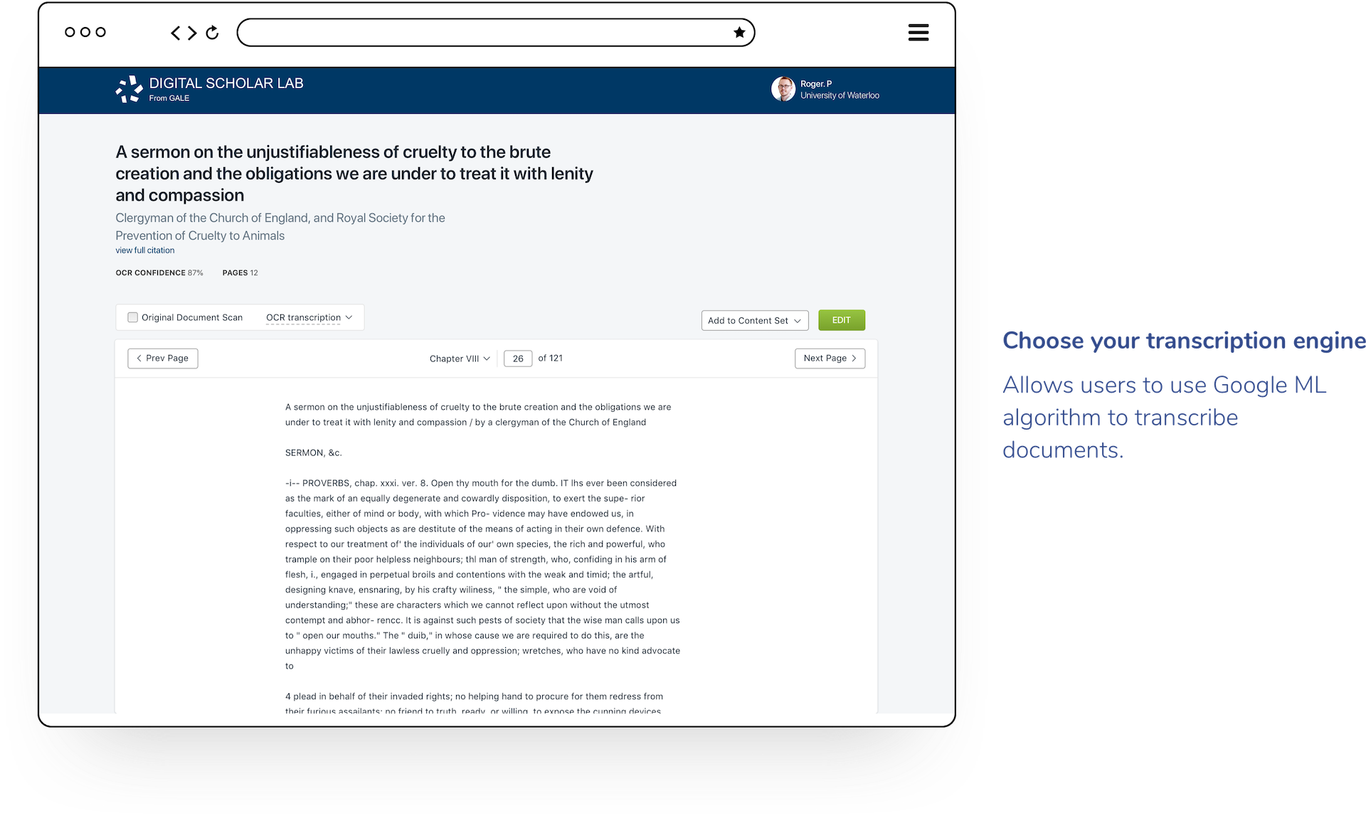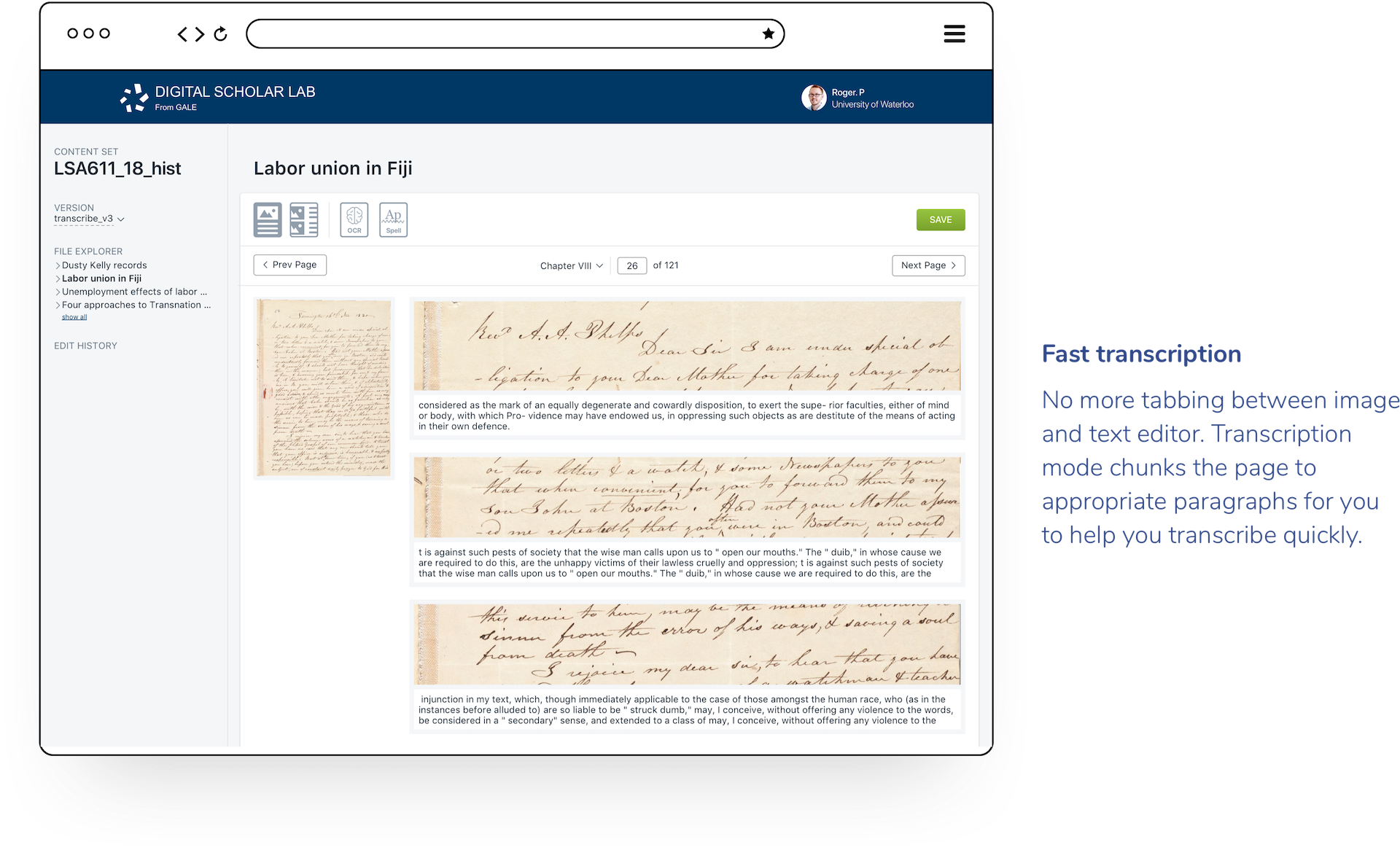 When I joined the UX team at Gale, Cengage, they were looking at the DH research lifecycle and found that DH researchers spend a considerable amount of time cleaning and transcribing text. I was tasked with using this opportunity to develop a transcription editor for DSLAB.