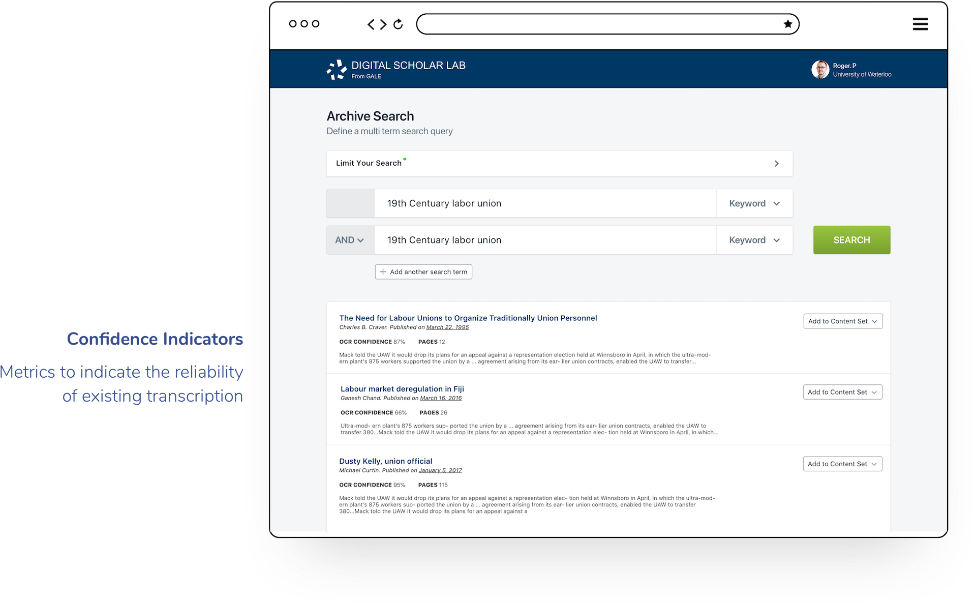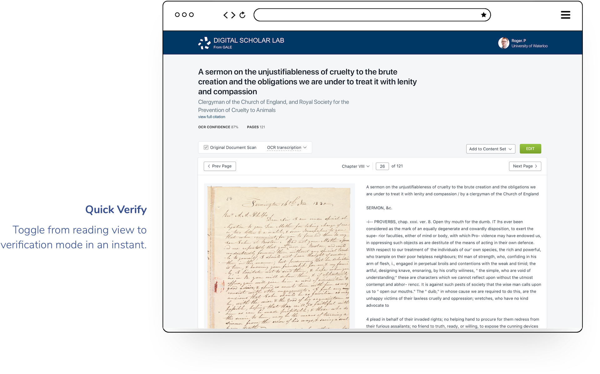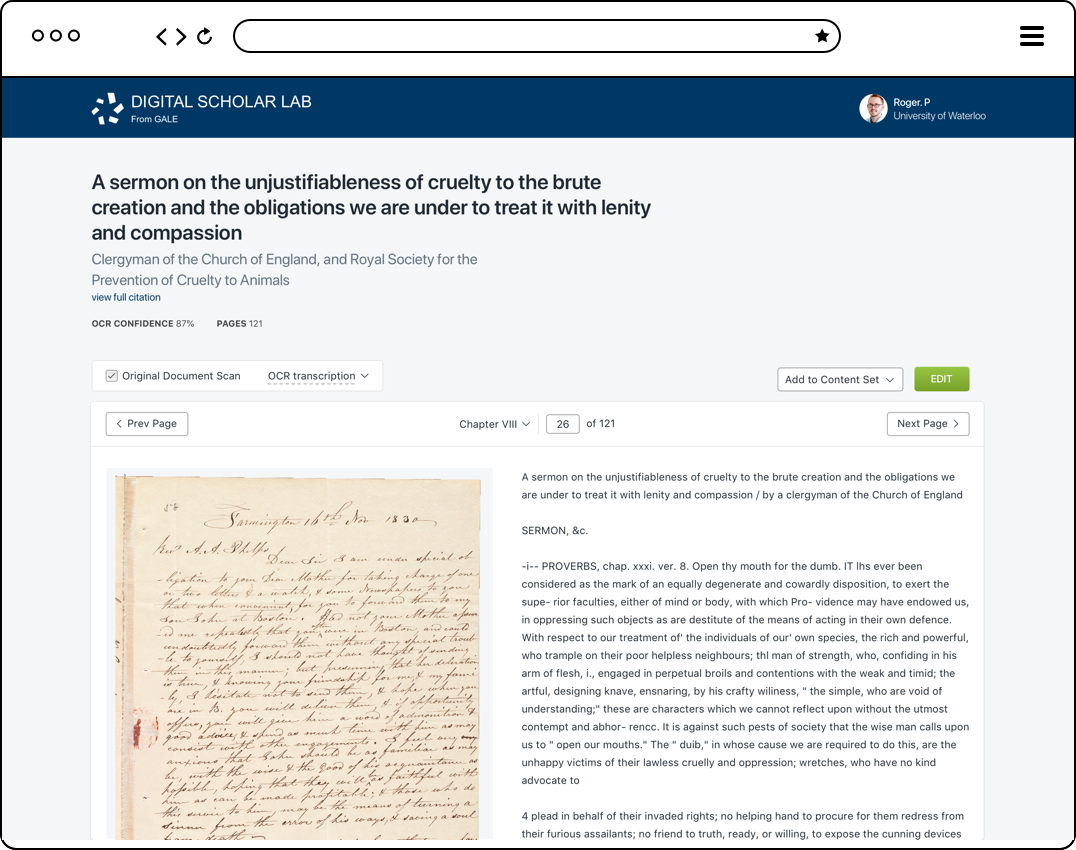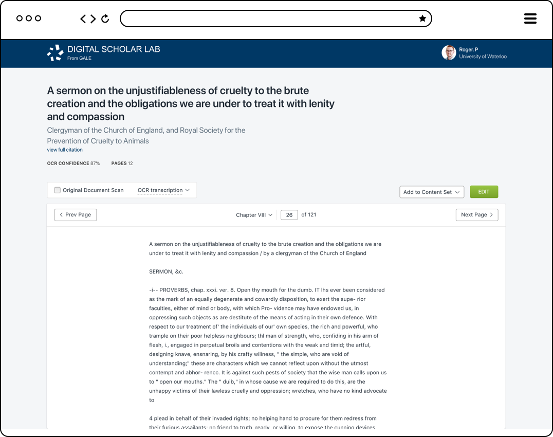 When I joined the UX team at Gale, Cengage, they were looking at the DH research lifecycle and found that DH researchers spend a considerable amount of time cleaning and transcribing text. I was tasked with using this opportunity to develop a transcription editor for DSLAB.