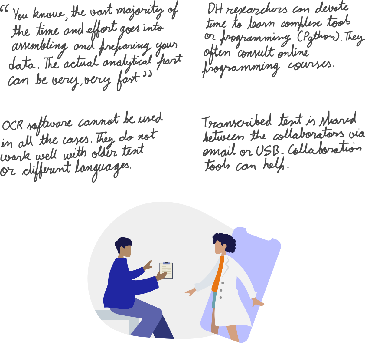 I learned from the interview that larger DH projects and academic setting involve frequent collaboration between the researchers. There is no standard way to document and version large projects and files are often passed around in USB drives, email or online storage drives. Since transcription and collaboration is the most time-consuming part of the process, a collaboration tool could make research easier in DSLAB.